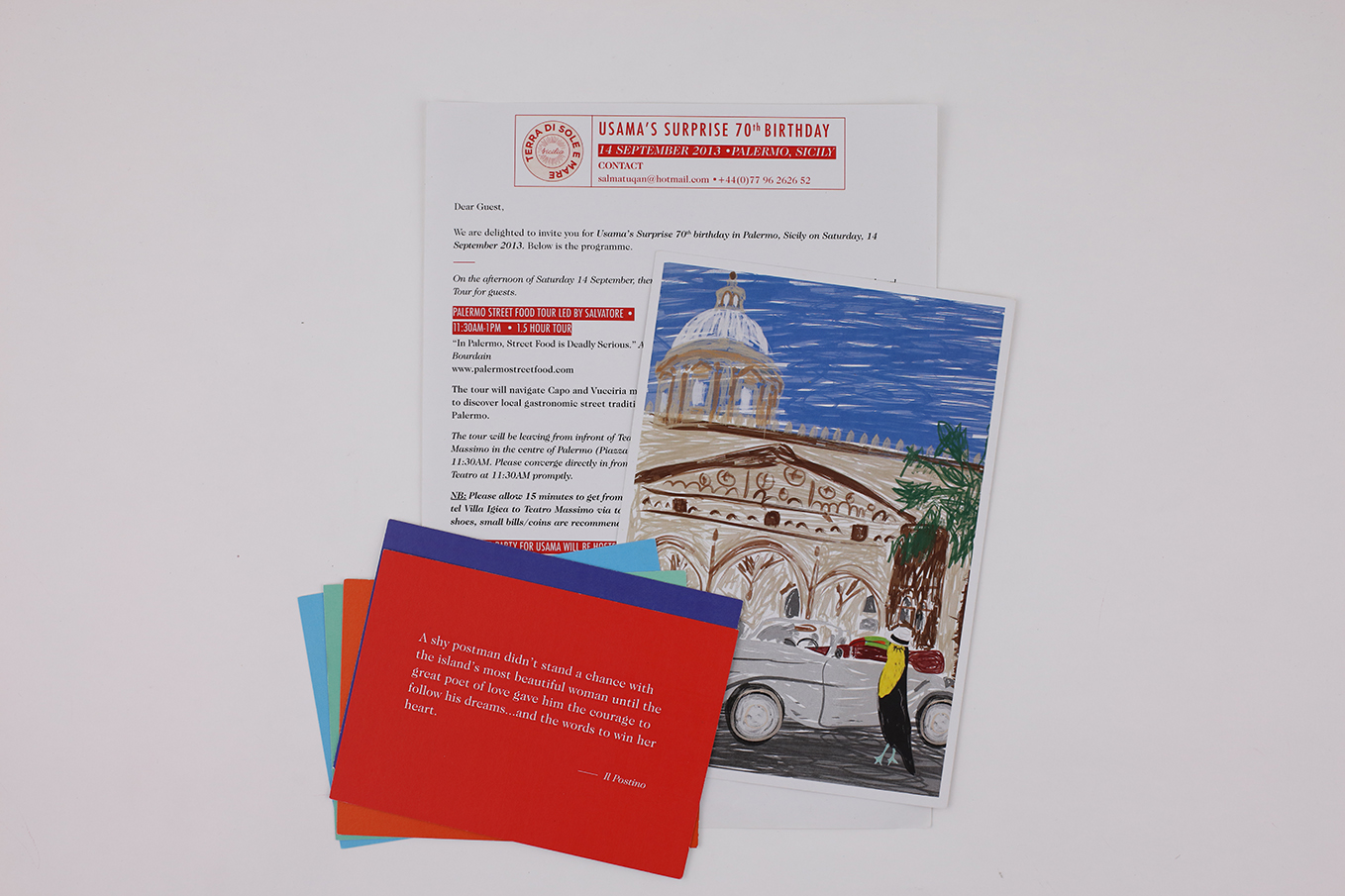 A personal commission of an invitation for a 70th birthday party which included the invite card, a series of five postcards featuring quotes from books and films set in Sicily, and an invitation letter.